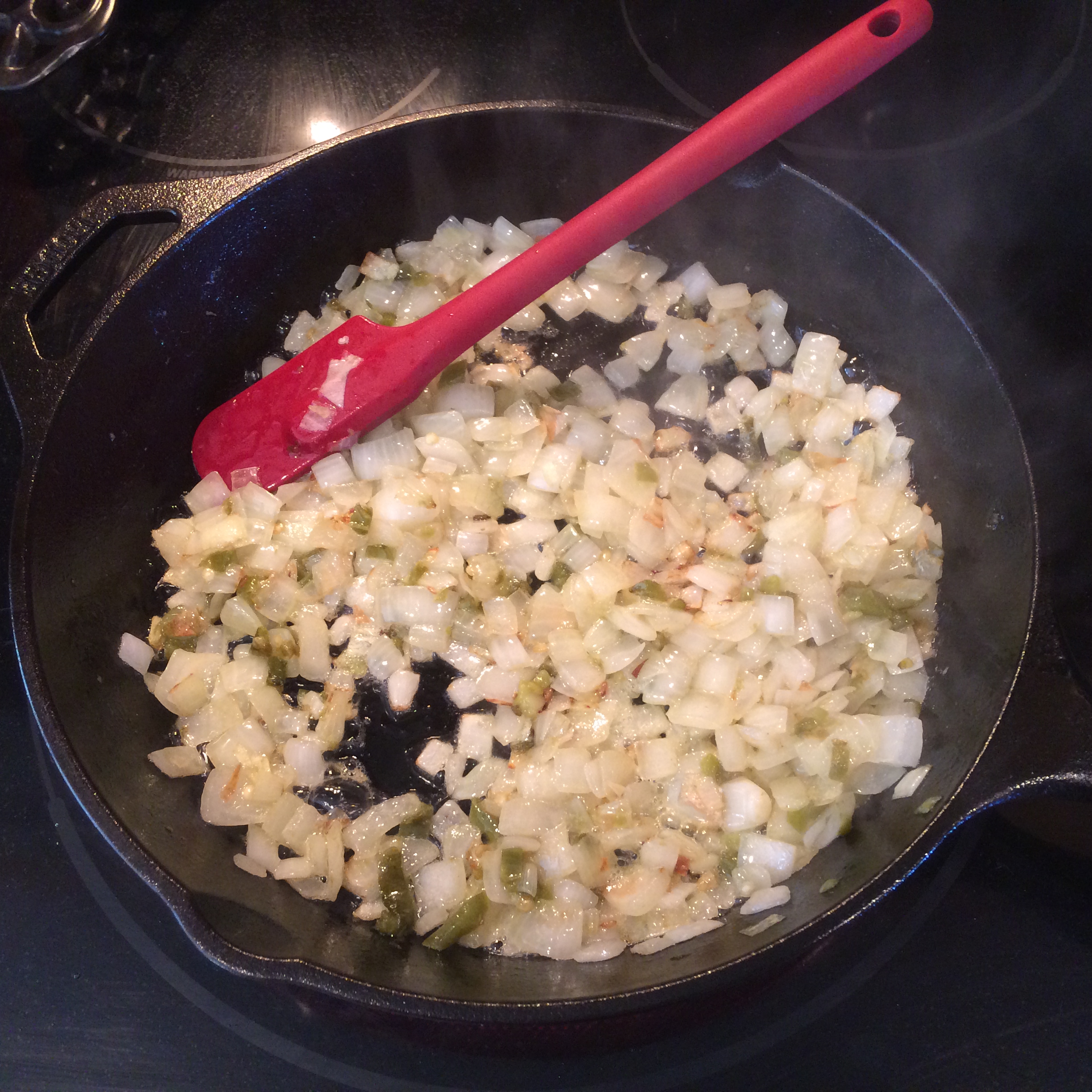 - Add butter and oil into a cast iron skillet and melt the butter over medium heat. Add the onions and jalapeno and saute around 10 – 12 minutes until brown around the edges, stirring often.