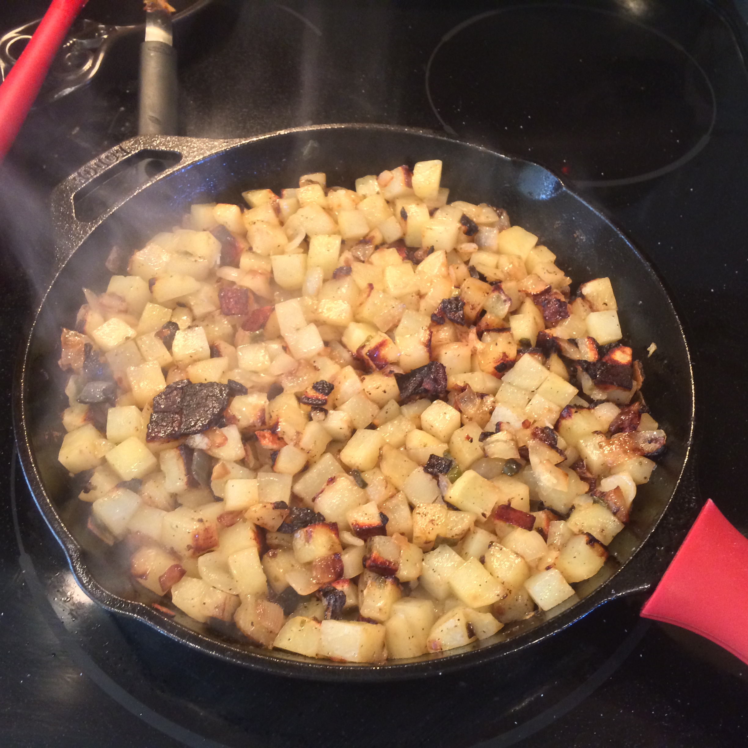 - Flatten out the hash browns in the skillet with a spatula and allow to cook without stirring for five minutes. After five minutes stir up the potatoes well and flatten them out with the spatula again. Cook for another three minutes and stir and flatten again. Let cook for one more three-minute batch. The potatoes should be well browned around the edges (some will be less and some will be more).