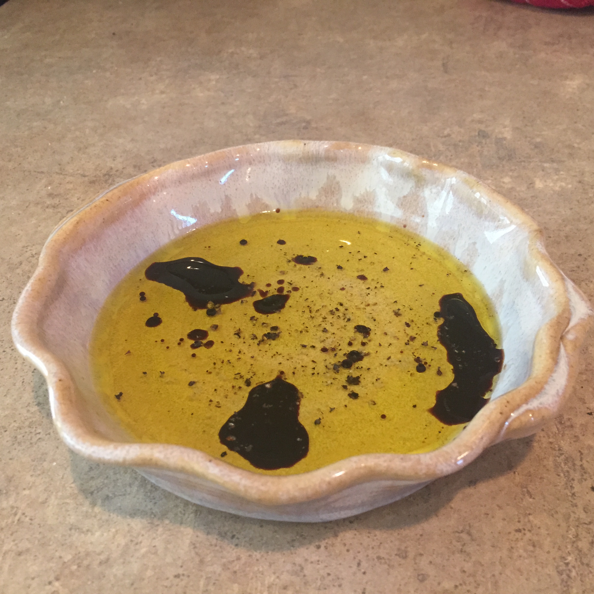 - Add olive oil into a good bowl for dipping. Add vinegar over the top.