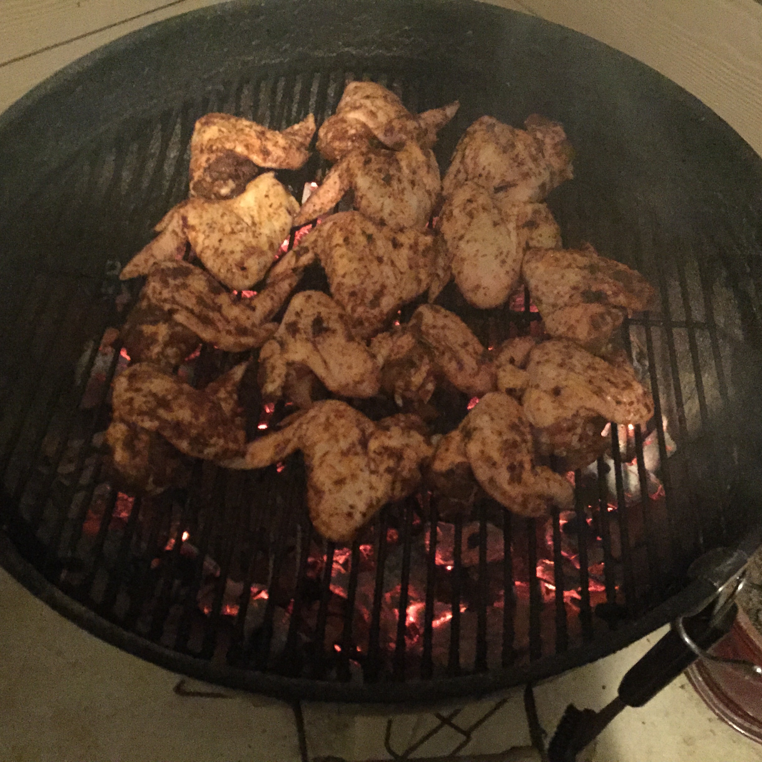 You could smoke these wings on gas too (with a chip box for smoking) but I love cooking on my old Weber. It’s simple and never disappoints. If you cook with charcoal having a chimney to start your coals makes it a lot easier and it doesn’t require using lighter fluid or match light which will take away from the flavor the coals give your food. All you need is to ball up some newspaper under the chimney and give it a light; give it time and about 20 minutes later your coals will be ready to go.